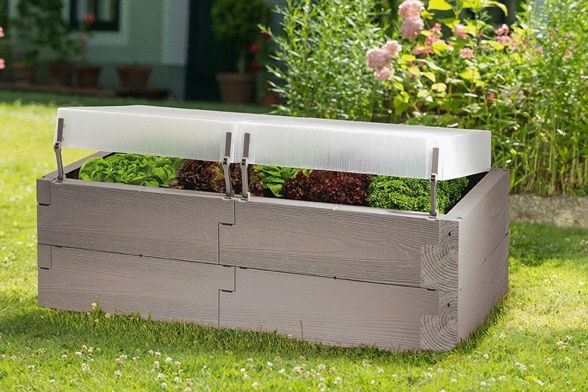 Beim Timber Komplett-Set sind die mitgelieferten Thermohauben wärmeisolierend und lassen sich in verschiedene Lüftungsstellungen windsicher verriegeln oder im Sommer ganz abnehmen. Das Beet lässt sich durch als Zubehör erhältlich Elemente auch nachträglich in Länge und Höhe erweitern und ist von der Schneckenkante bis zum Profi-Frühbeet modular ergänzbar.