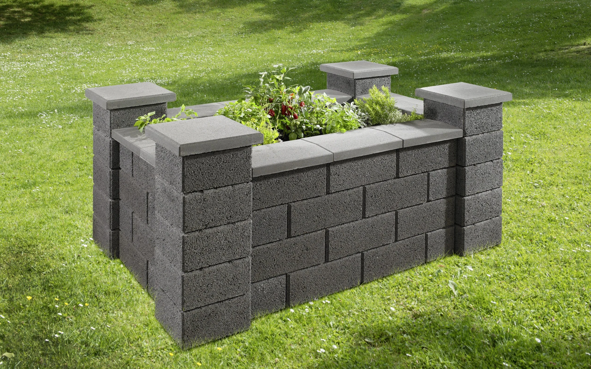 Die klassische Gartenmauer in drei verschiedenen Farben mit Scheinfugen eignet sich perfekt zum Mauerbau. Auch als Hochbeet macht sie eine gute Figur und bietet viele verschiedene Aufbauoptionen. Die Hohlkammerelemente erleichtern den Aufbau und die oberste Steinlage kann wahlweise mit einem Pflanzsubstrat befüllt und bepflanzt oder mit Hilfe einer Abdeckplatte als praktische Ablagefläche genutzt werden.