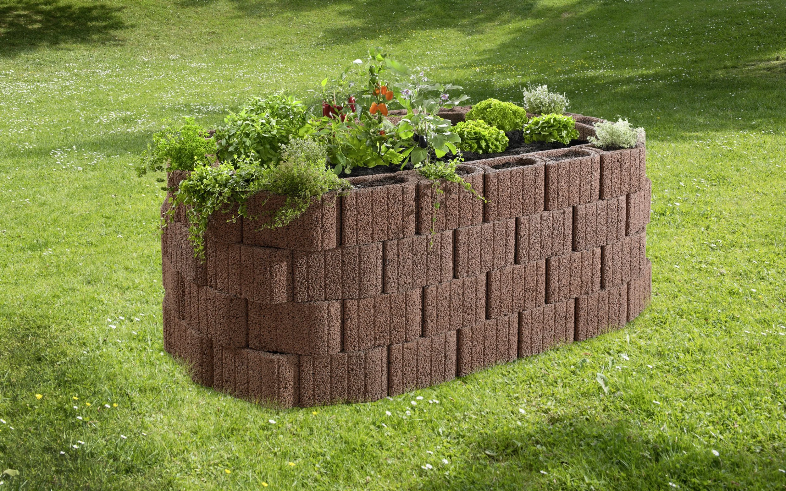 Mit dem gerillten und gekehlten Minipflanzstein Plus lassen sich kostengünstig runde und ovale Hochbeete gestalten. Neben der Beetfläche eignen sich auch einzelnen Hohlkammerelemente zum Begrünen mit Kräutern und hängenden Pflanzen.