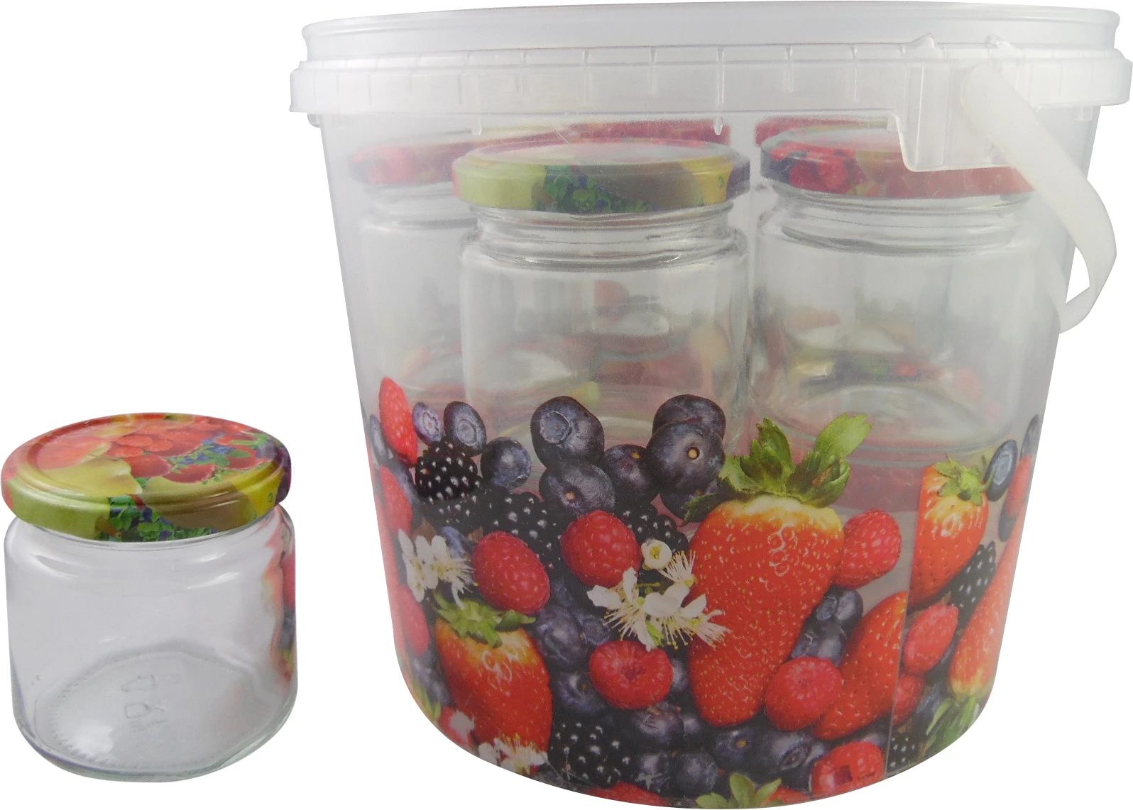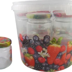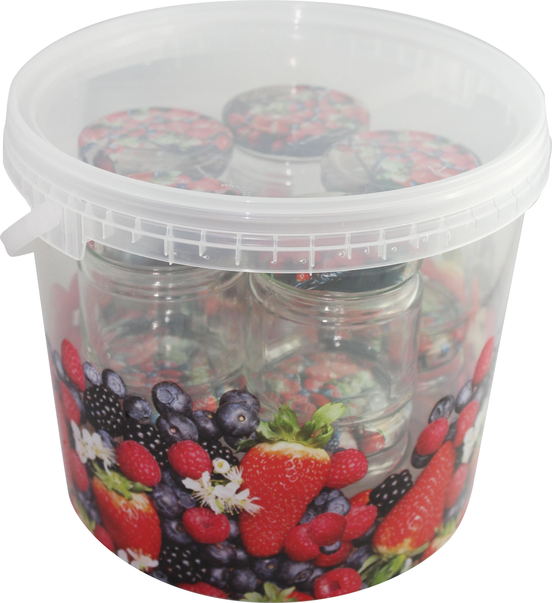 Pflückeimer aus Plastik mit 10 Stück Einmachgläsern 210 ml, alle Einmachgläser mit Twist-off Deckeln mit Früchtedesign, sowohl der Eimer, also auch die Gläser können in der Spülmaschine gereinigt werden