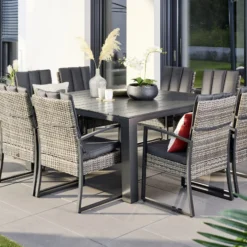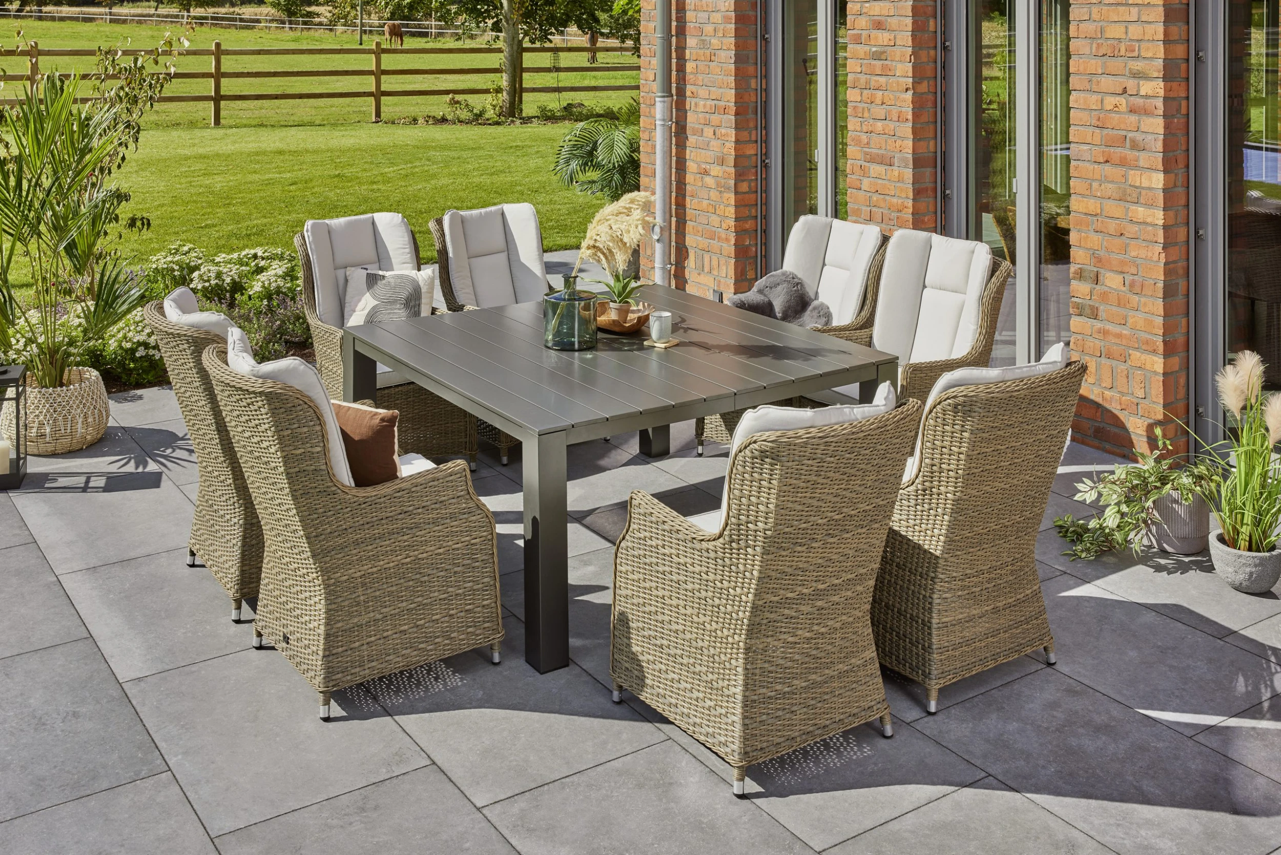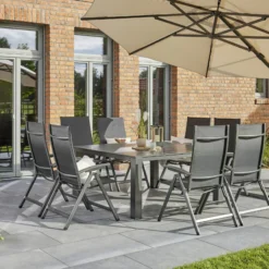 Der Aluminium Esstisch Marseille ist wetterfest und sehr leicht zu reinigen. Das anthrazit farbene Gestell und die Aluminium Belattung verleiht dem Dining Tisch einen modernen Flair und macht ihn zu einem echten Allrounder. Durch das quadratische Design des Tisches mit der Abmessung 152 x 152 cm finden bis zu 8 Personen Platz.