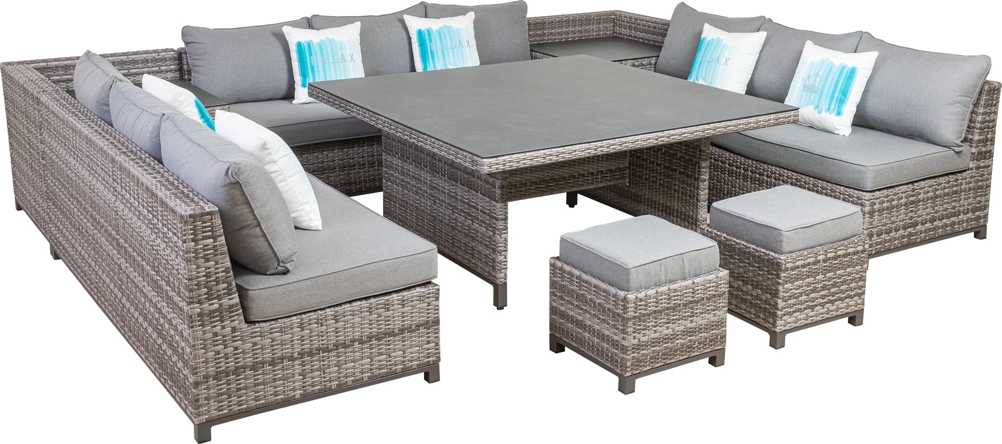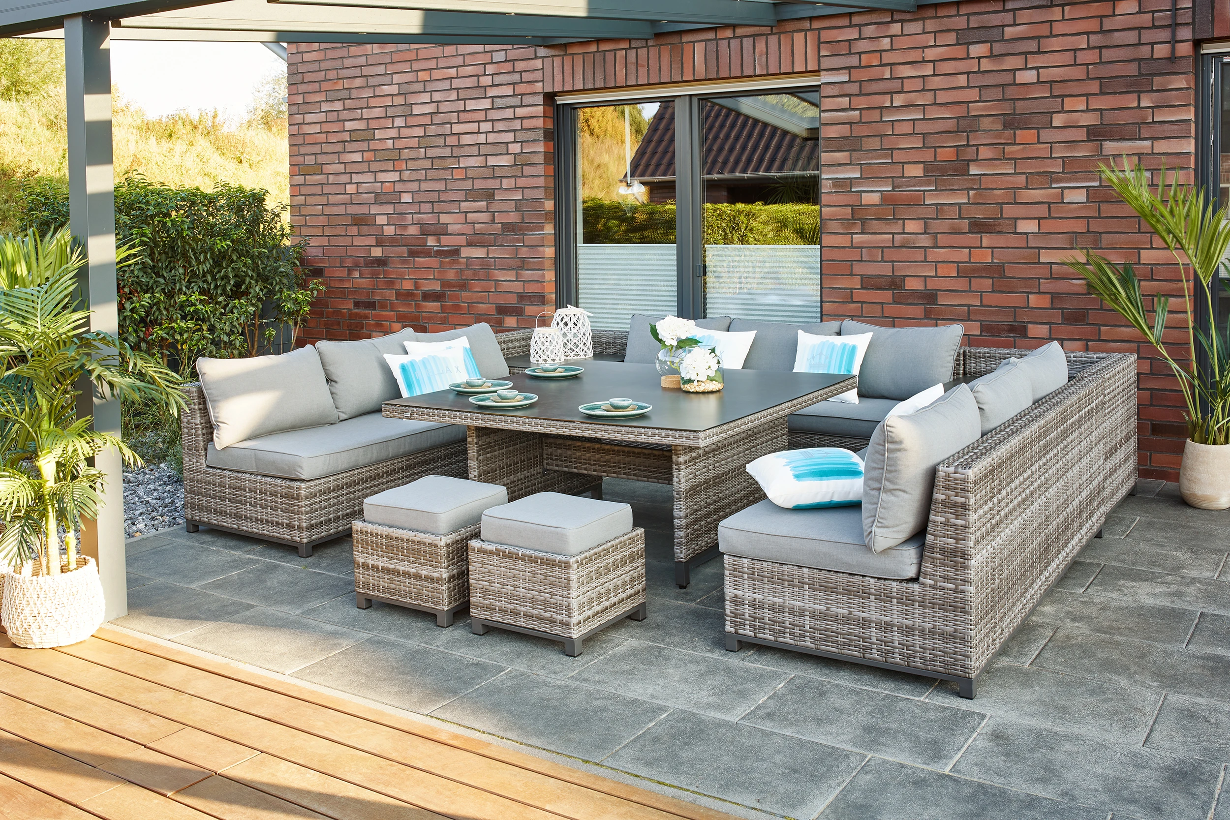 Dieses edle Modell, der Marke Primaster, lässt keine Wünsche offen. Die Garnitur bietet viel Platz für Freunde und Familie. Die Eckteile sind eine optimale Abstellfläche für Getränke oder Dekoration. Die bequemen Sitz-und Rückenkissen sorgen für komfortablen Sitzkomfort. Die farblich abgestimmten Zierkissen runden die Garnitur ab. Der Esstisch mit einer eleganten Keramikglasplatte und zwei Hocker machen dieses Möbelset, aus witterungsbeständigem Kunststoffgeflecht, zu mehr als nur einer klassischen Sitzgruppe. Hier erleben Sie tollen Wohnkomfort für ihre Terrasse.