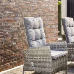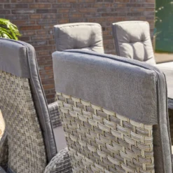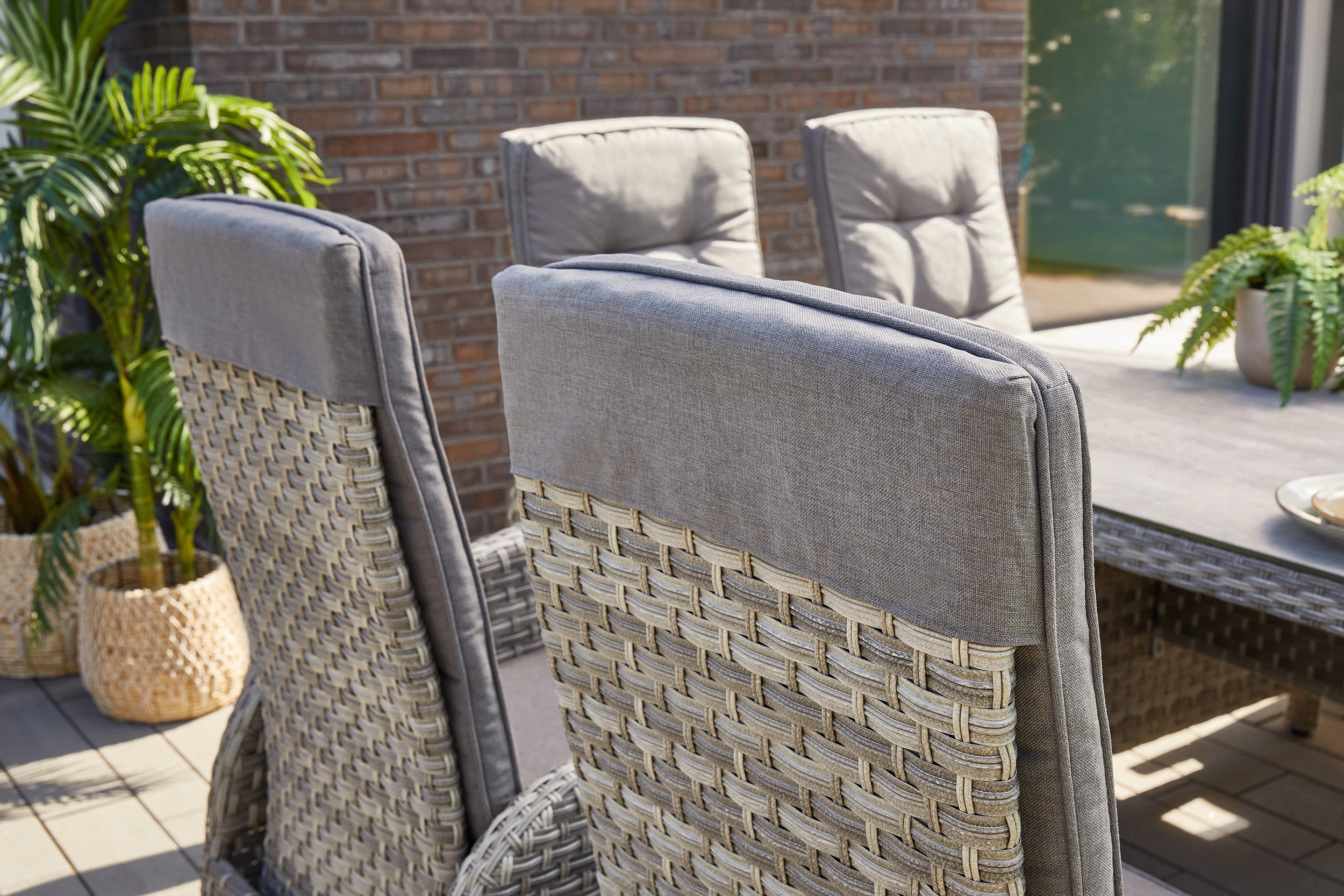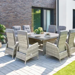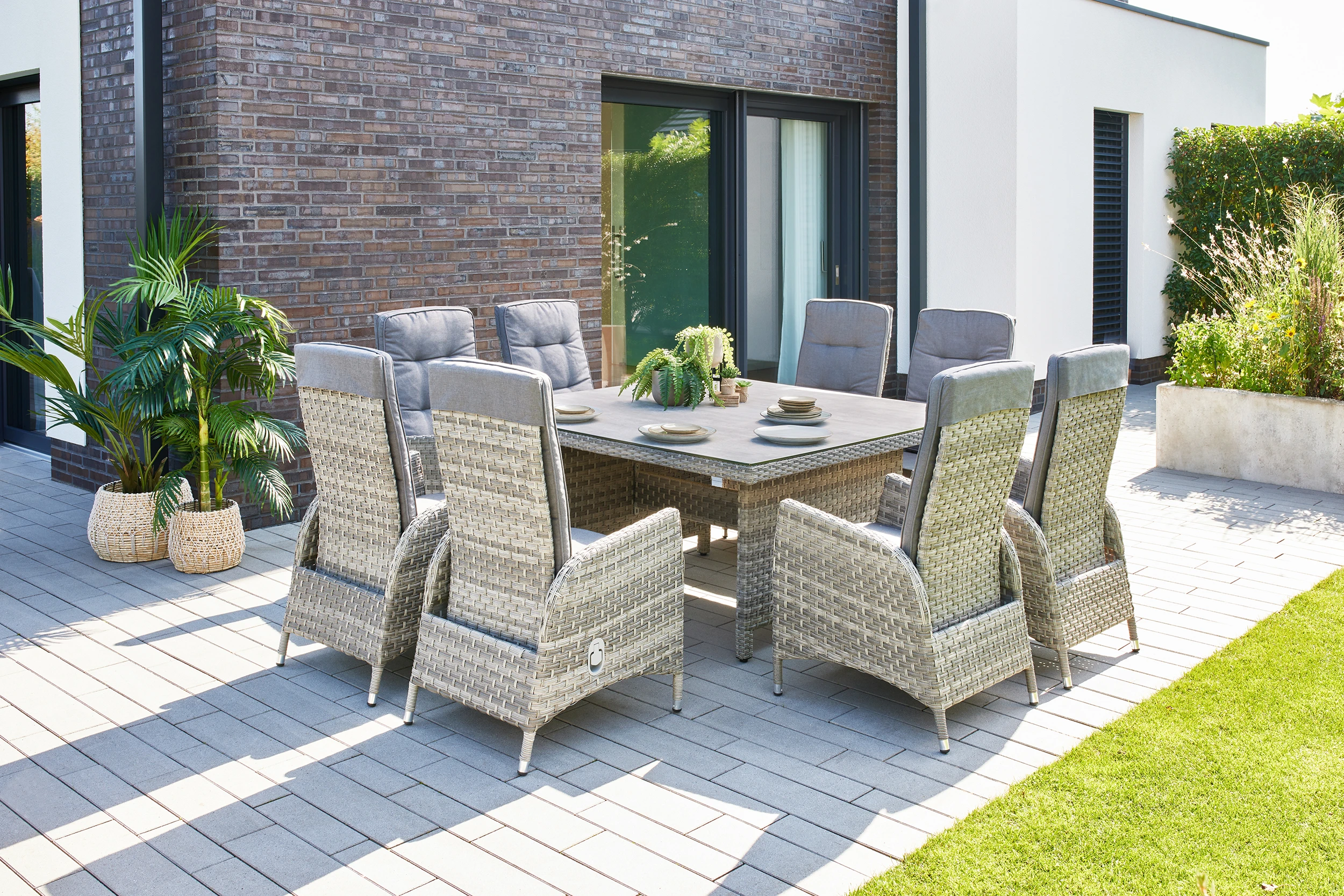 Bis zu 8 Personen können an der extra großen Sitzgruppe gemeinsam Platz nehmen. Für den perfekten Sitzkomfort sind alle Sessel der Gruppe inkl. komfortablen Sitzauflagen und in der Rückenlehne stufenlos verstellbar. Der Tisch ist mit einer 6 mm Keramikglasplatte ausgestattet.