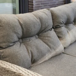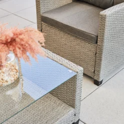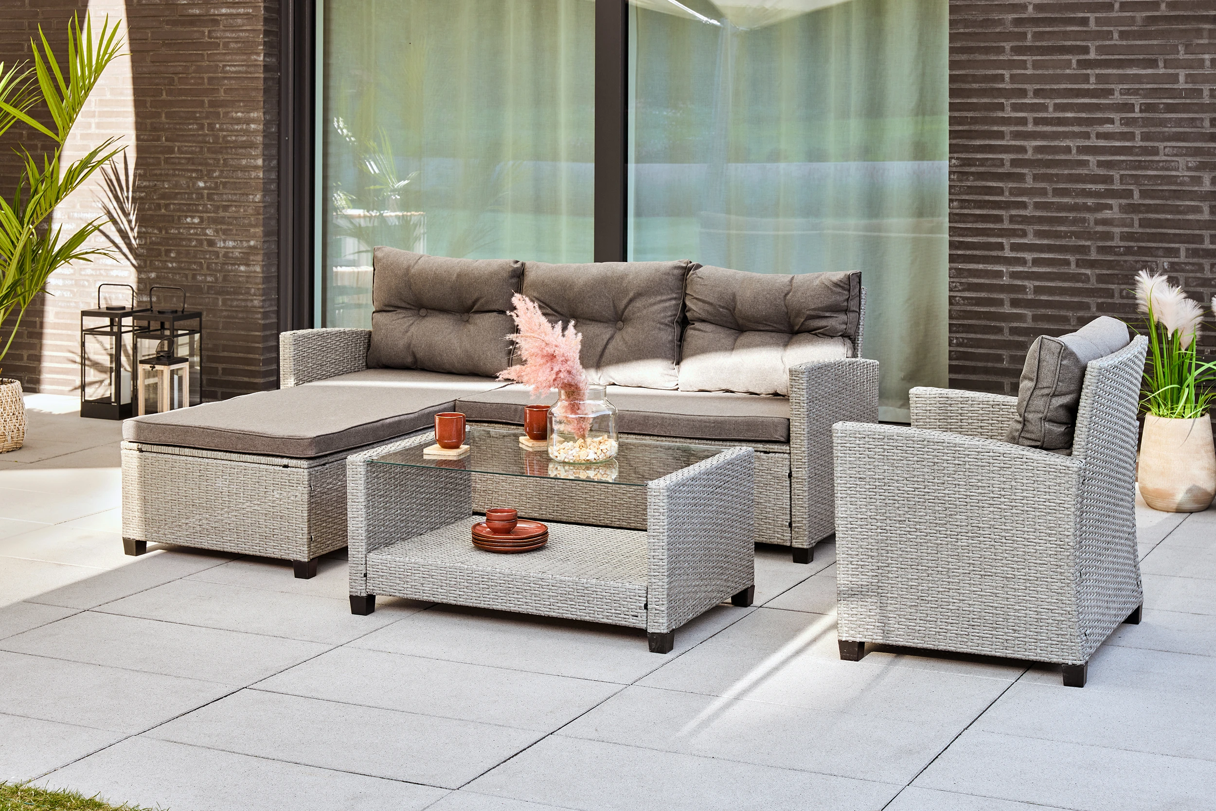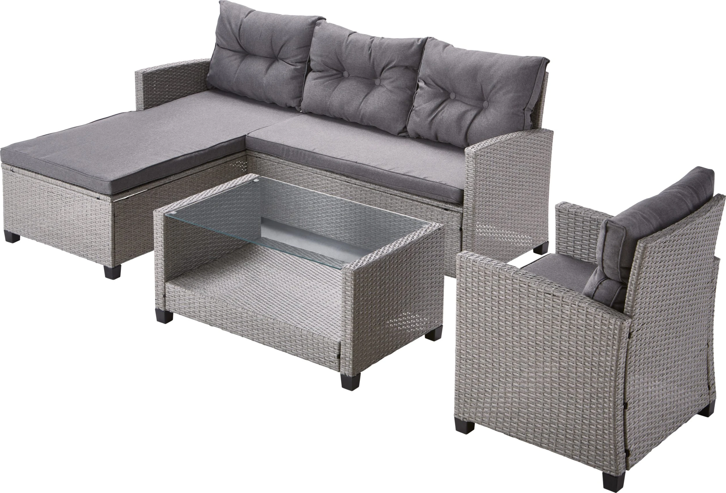 Modern und bequem ist dieses Set Madison der Marke TrendLine. Dank der weich gepolsterten Sitz und Rückenkissen ist für einen hohen Sitzkomfort gesorgt. Egal ob auf ihrer Terrasse, Garten oder Wintergarten ist dieses Möbelset ein wahrer Blickfang. Schaffen Sie sich mit diesem Gartenmöbelset einen neuen Lieblingsplatz für schöne Stunden mit Ihren Liebsten und genießen Sie Ihre Zeit im Freien. Das Set besteht aus: 1 Zweisitzer-Sofa, 1 Chaiselongue, 1 Sessel 1 Tisch 5 mm Sicherheitsglas-Platte