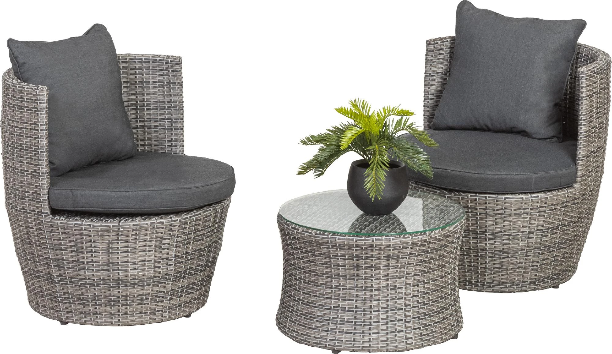 Klein aber fein ist dieses Balkonset Loris der Marke TrendLine. Eine gemütliche Sitzgelegenheit aus einem witterungsbeständigen Kunststoffgeflecht für ihren kleinen Balkon. Das Design ist praktisch und Stylisch. Mit der komfortablen Polsterung in der Farbe grau genießen Sie wohnlichen Komfort unter freiem Himmel. Bei Nichtgebrauch lassen sich die einzelnen Elemente kinderleicht übereinander anordnen.