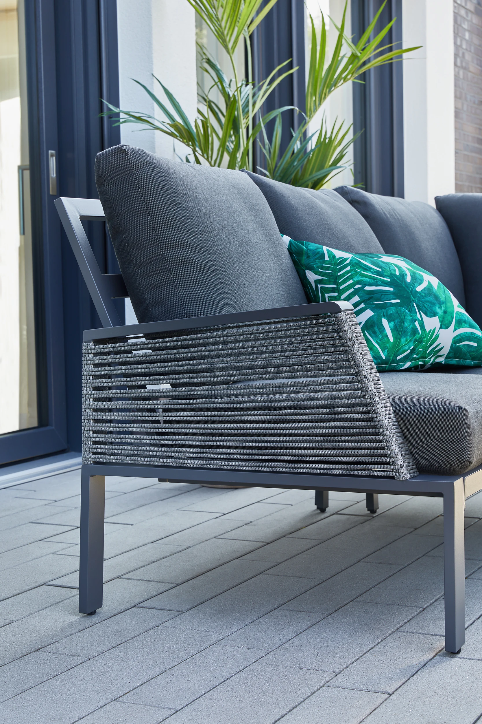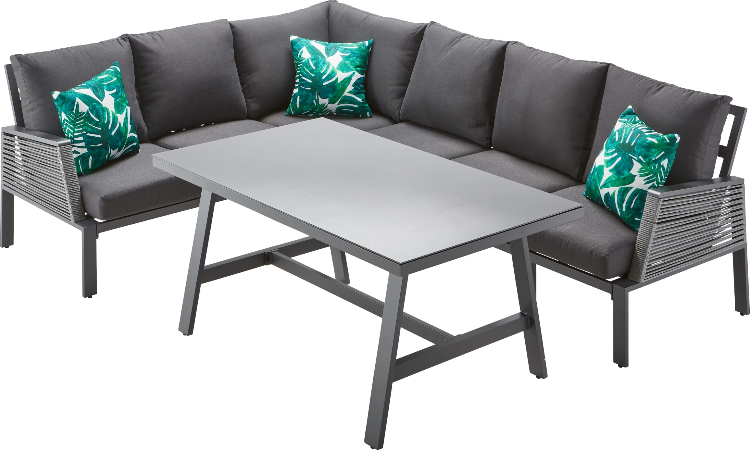 Stylisch und modern, dieses Möbelset der Marke TrendLine, lässt keine Wünsche offen. Die Rücken und Sitzkissen sowie, farblich abgestimmte Zierkissen, sorgen für hohen Sitzkomfort. Die witterungsbeständige Kunststoff Schnürung, in der Farbe grau, machen diese Garnitur zu einem Blickfang in ihrem Garten. Ein tolles Set das Komfort und Design perfekt verbindet.