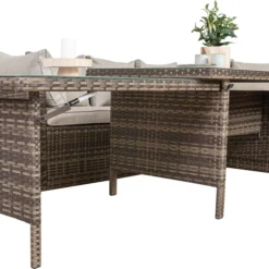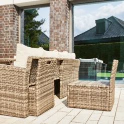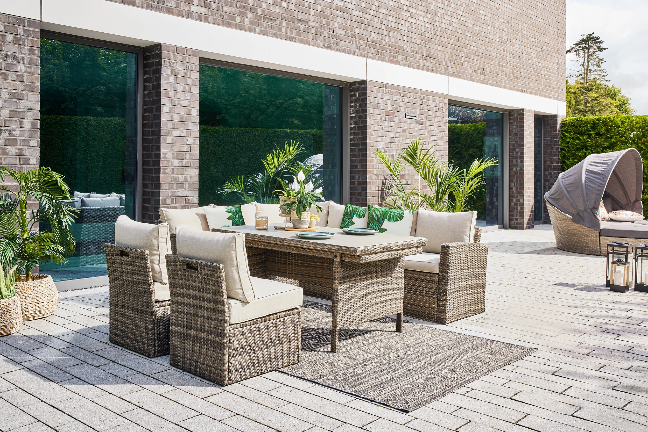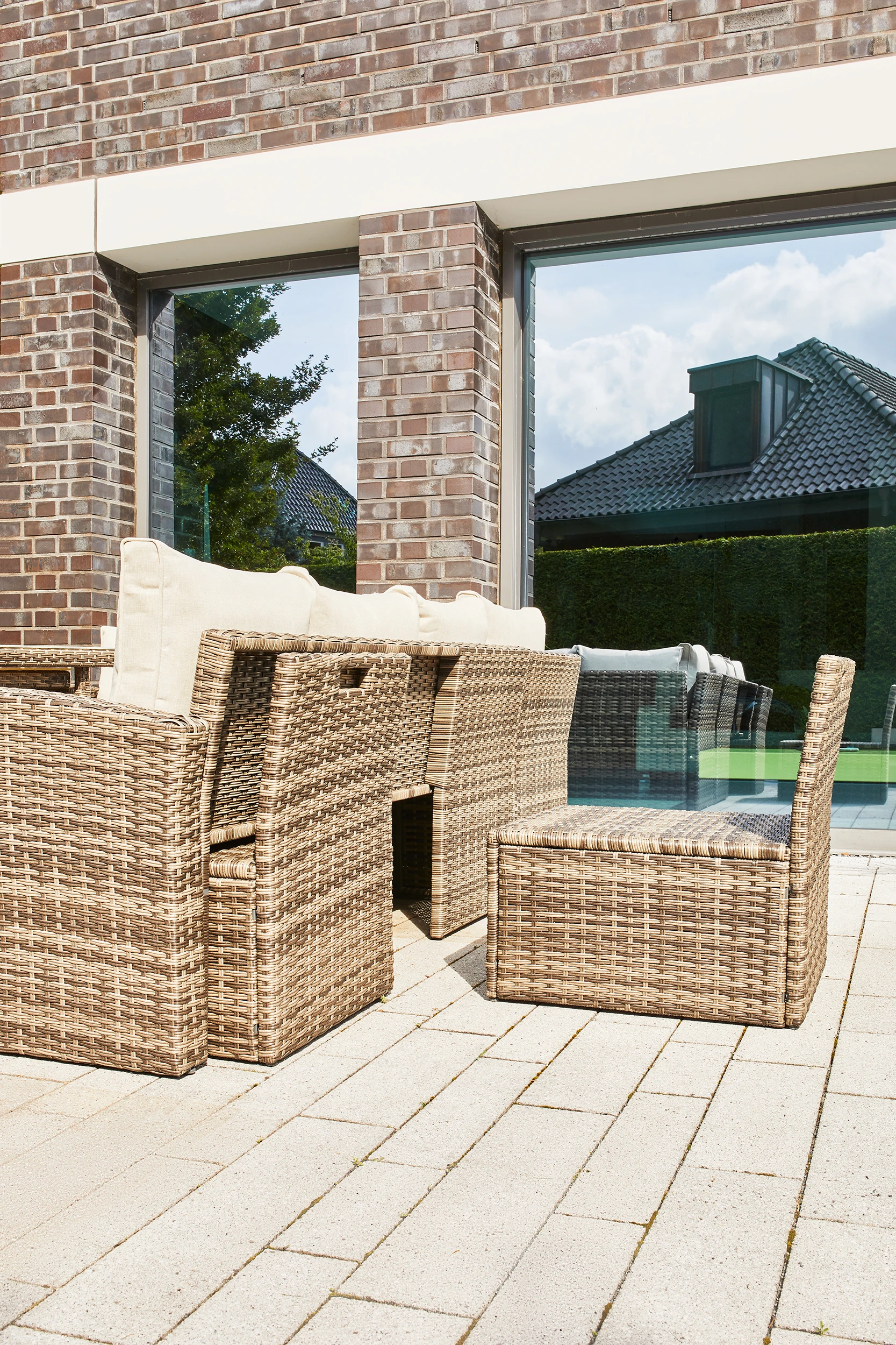 Die angenehme Sitzhöhe dieser Garnitur ermöglicht Ihnen bequemes und komfortables Sitzen und lädt Sie anschließend zum Entspannen ein. Die Garnitur aus braunem Kunststoffgeflecht mit farblich abgestimmten Rücken- und Sitzkissen lässt keine Wünsche offen. Genießen Sie wohnlichen Komfort auf Ihrer Terrasse. Nicht nur optisch überzeugt die Dining Lounge Gruppe Avila. Durch die “hidden chairs” Konstruktion können aus dem Rücken der Sitzbank zwei Sitzelemente gezogen werden, mit welchen Sie die Lounge in der Länge erweitern oder diese als Sitzelemente nutzen können. Hinzu kommt noch die Ausziehtischfunktion. Durch eine Gasdruckfunktion kann aus dem Haupttisch ein weiterer Tisch herausgezogen werden. Sie können somit den Haupttisch von ca. 145 x 85 x 67 cm noch einmal um einen kleineren Tisch von 105 x 72 x 63 cm erweitern. Die aufliegenden Strukturglasplatten sind besonders pflegeleicht.