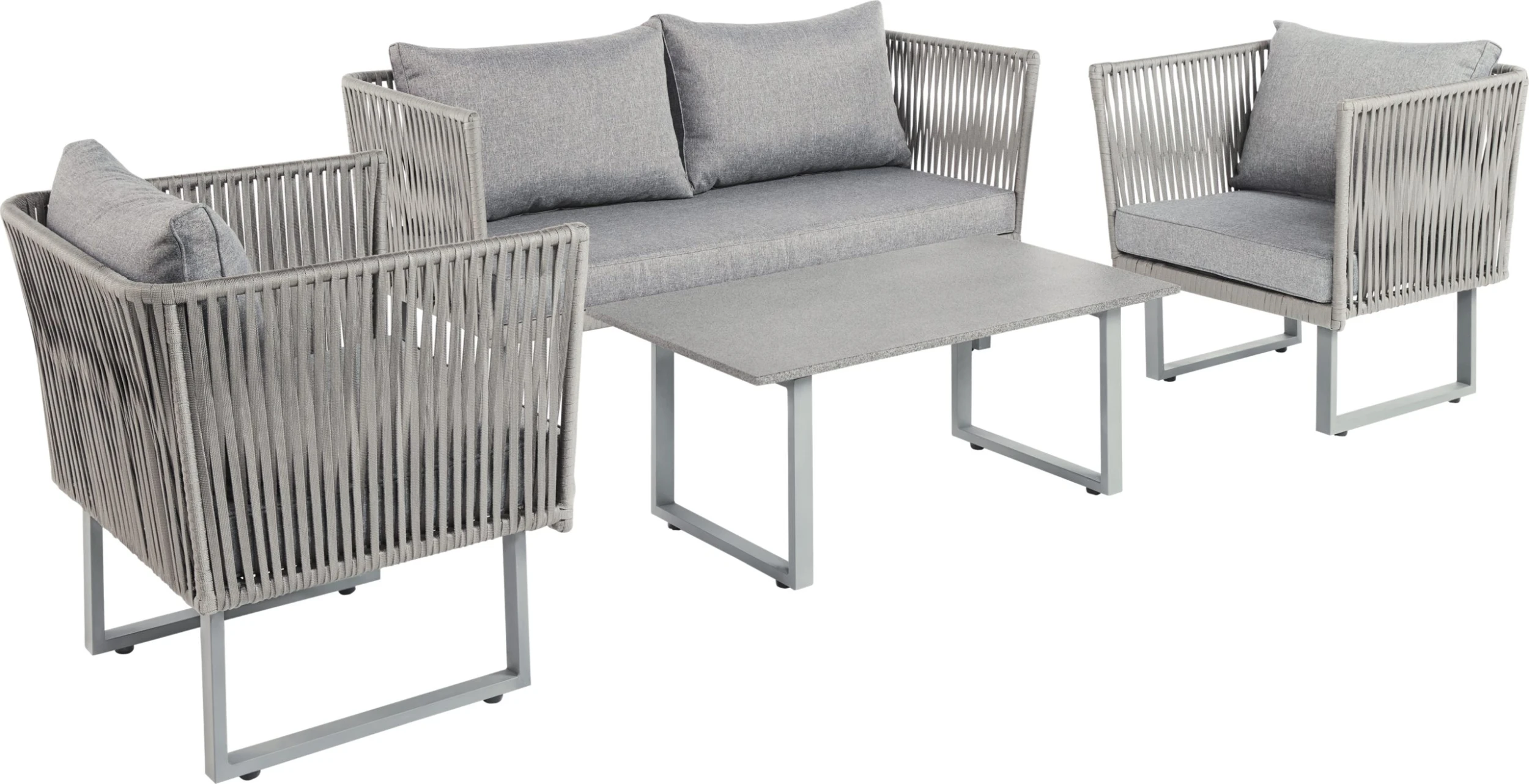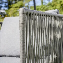 Dieses Sofa- Set ist eine wahrer Blickfang auf ihrer Terrasse. Das modere Seilgeflecht aus witterungsbeständigem Kunststoff ist optisch sehr ansprechend und verleiht der Garnitur einen besonderen Akzent. Die bequemen und farblich passenden, Sitz und Rückenpolster, bieten einen hohen Sitzkomfort und laden zum gemütlichen Entspannen ein.