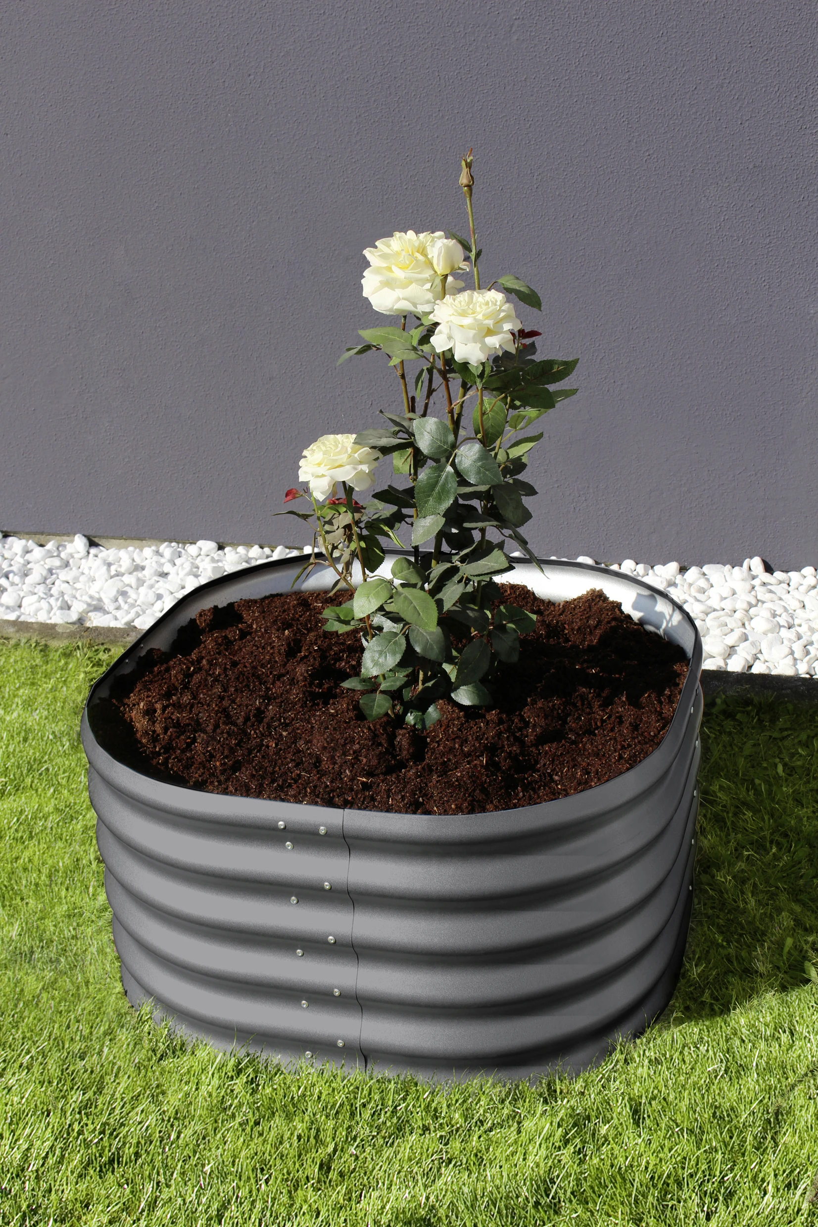 Hochbeete dienen der Arbeitserleichterung bei der Aufzucht von Gemüse und Kräutern, weil durch sie das ständige Bücken bei der Gartenarbeit entfällt. Außerdem führen sie zu einer merklichen Ertragssteigerung, da so für die Pflanzen optimale Bodenverhältnisse geschaffen werden können. Hergestellt aus dem extrem witterungsbeständigen Zincalume® benötigt das Hochbeet Terra im Gegensatz zu Holzbeeten keine Innenfolie: Es reagiert nicht mit organischen Materialien wie Erde und Pflanzen, wird also nicht dadurch beschädigt, gibt keine ungesunden Stoffe ab und verhält sich geschmacksneutral. Das Vitavia Hochbeet Terra besticht darüber hinaus durch moderner Optik und eine Vielzahl an Erweiterungsmöglichkeiten und Formgebungen: Die im Bausatz angelieferten einzelnen Module sind vorgebogen, die Verbindungsstücke vorgebohrt. Größe und Gestalt können mithilfe des Hochbeets Terra BASIC, der geraden Hochbeeterweiterung Terra STRETCHED und der gebogenen Erweiterung Terra CURVE frei kombiniert werden. Das Hochbeet Terra RUND ist die kleinste Variante und kann ebenfalls gut als dekorativer Pflanzkübel genutzt werden. Durch die frei kombinierbaren Module sind den Gestaltungsmöglichkeiten kaum Grenzen gesetzt. Zwischen die beiden runden Abschlusselemente und nach jeder Erweiterung Terra CURVE können können zwei gerade Bauelemente (Erweiterung Terra STRETCHED) aneinander gesetzt werden. So kann das Hochbeet auch optimal zur Abtrennung von Zonen im Garten oder als Sichtschutz eingesetzt werden. Die Hochbeete Terra RUND, Terra BASIC sowie die Erweiterung Terra STRETCHED sind in den Farben Blank, Granit und Rubin in drei verschiedenen Höhen erhältlich. In den Höhen von 40 und 63 cm sind die Hochbeete auch perfekt als Kinderbeet, Pflanzkübel, als Beet im Gewächshaus oder zur dekorativen Gartengestaltung einsetzbar. In der Standardhöhe von 86 cm steht die weitere Farbe Schwarz zur Verfügung.